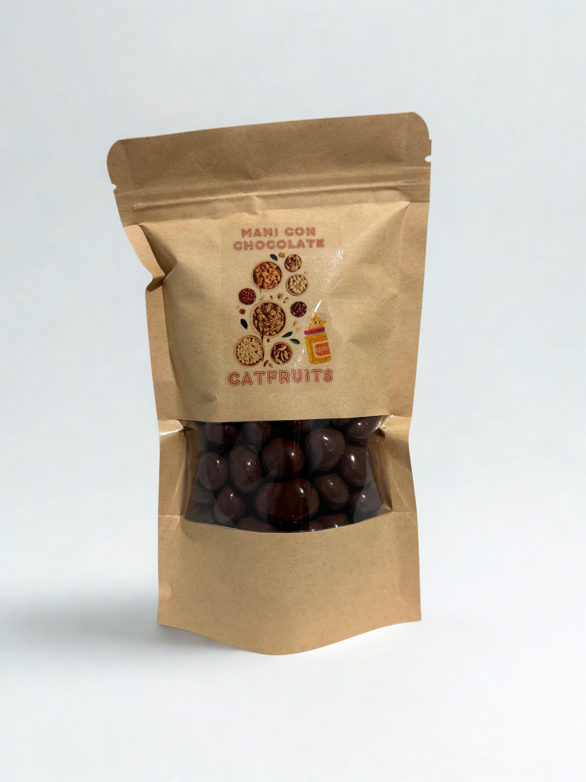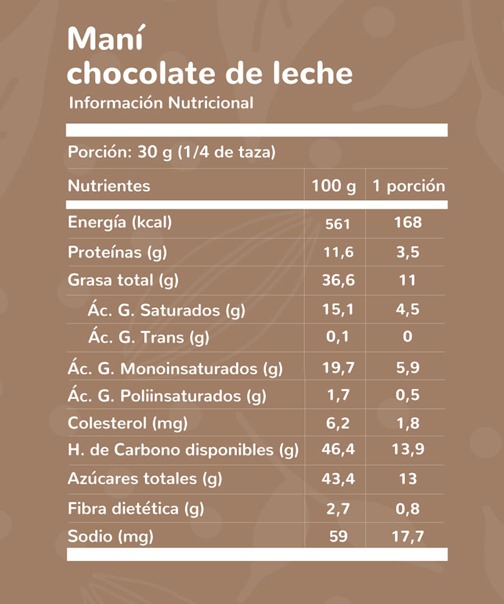 Cobertura chocolate leche (azúcar, manteca de cacao, pasta de cacao, suero de leche en polvo, leche entera en polvo, lecitina de soya, polirricinoleato de poliglicerol, saborizante idéntico al natural),Maní, azúcar impalpable, sellante (alcohol etílico, goma laca, aceite vegetal), abrillantador (jarabe de glucosa, agua, goma arábiga, ácido cítrico, sorbato de potasio). Puede contener: Soya, Maní, Leche, Sulfitos, Huevo, otros frutos secos, Sésamo, Mostaza y Lupino.
